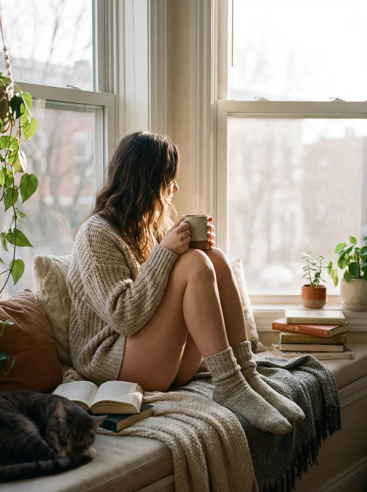 девушка сидит у окна с чашкой кофе, утренний мягкий свет, уютная атмосфера, теплые оттенки, натуральная поза, lifestyle photography, film grain, re...