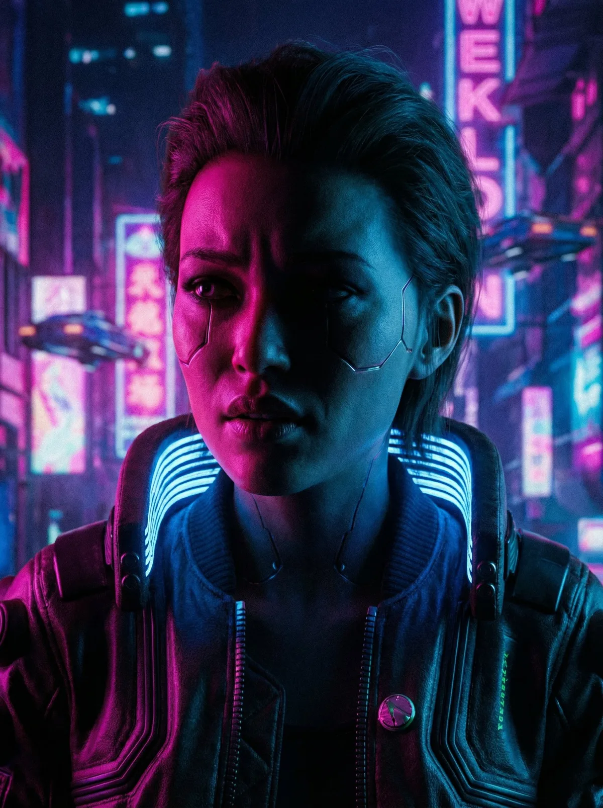 стильная аватарка в неоновом освещении, розово-синие оттенки, выразительное лицо, глубокие тени, cinematic lighting, futuristic aesthetic
