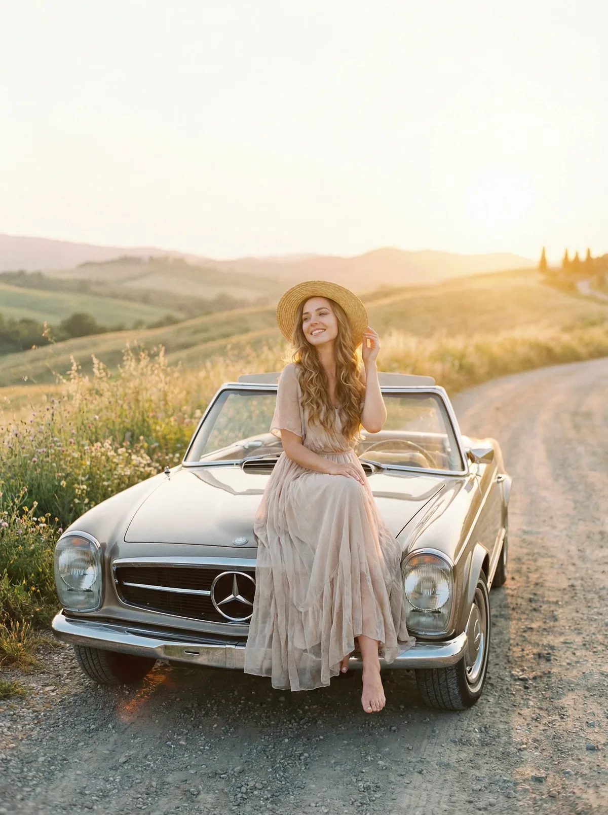 девушка с открытым кабриолетом на закате, мягкое солнечное освещение, романтическая атмосфера, high detail