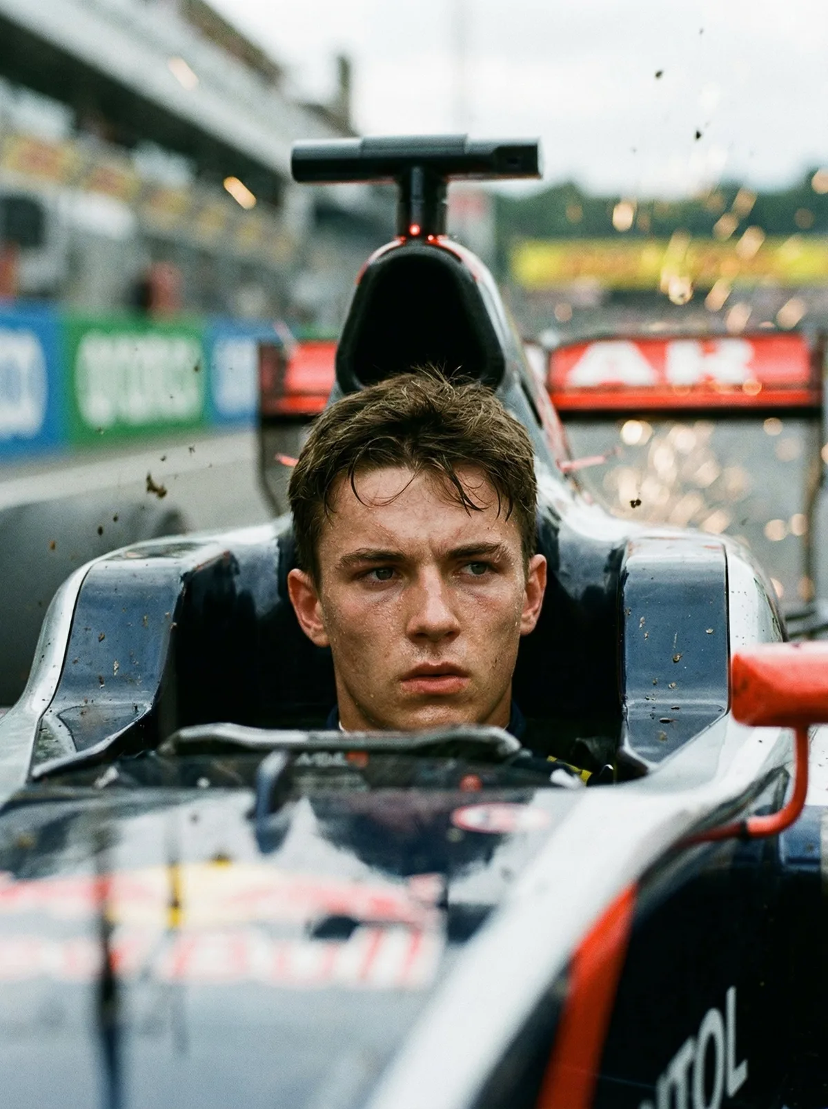 парень за рулем гоночного автомобиля, динамика, motion blur, акцент на лице и движении, cinematic style, realistic