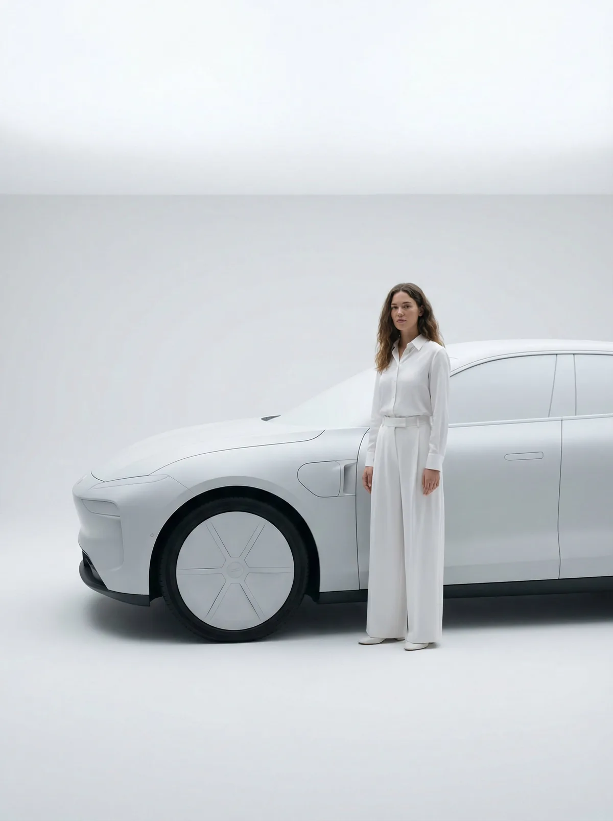 девушка с электромобилем на студийном фоне, минимализм, clean composition, ultra realistic, high detail