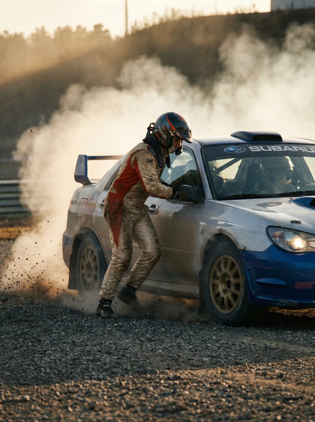мужчина с гоночным автомобилем на треке, динамика, дым и пыль, cinematic lighting, realistic motion effect