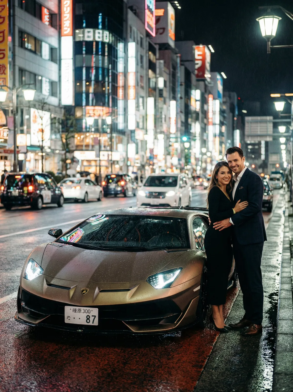 пара рядом с суперкаром на ночной улице, отражения неоновых огней, soft lighting, cinematic photography, high quality