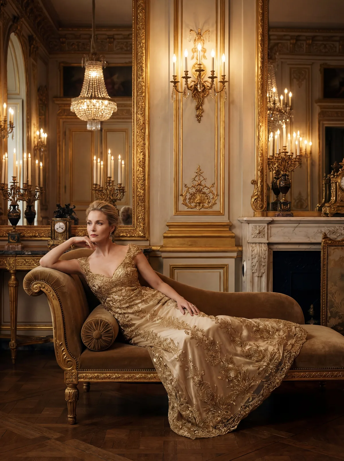 фотосессия в стиле luxury, дорогой интерьер, золотые элементы, мягкий теплый свет, элегантная поза, cinematic shadows, high detail
