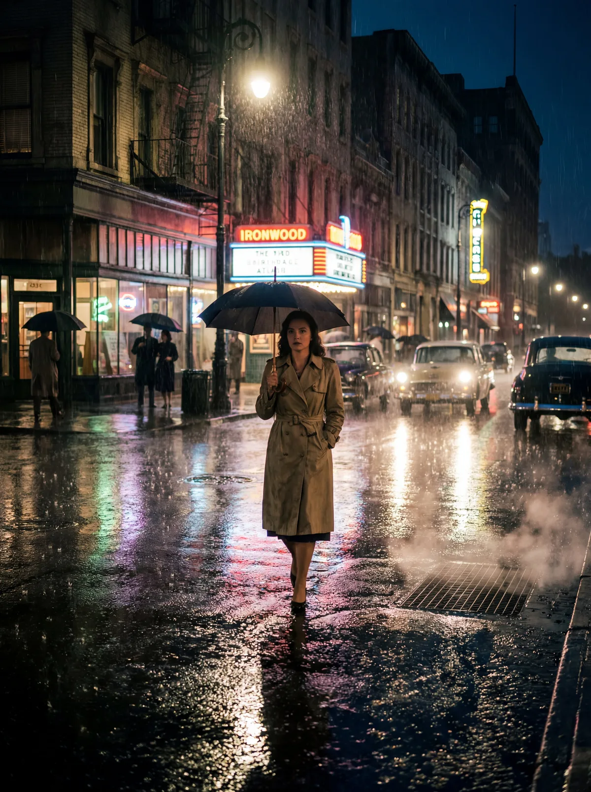 уличная фотосессия под дождем, мокрый асфальт, отражения огней, атмосферный свет, драматичное настроение, cinematic lighting, ultra realistic