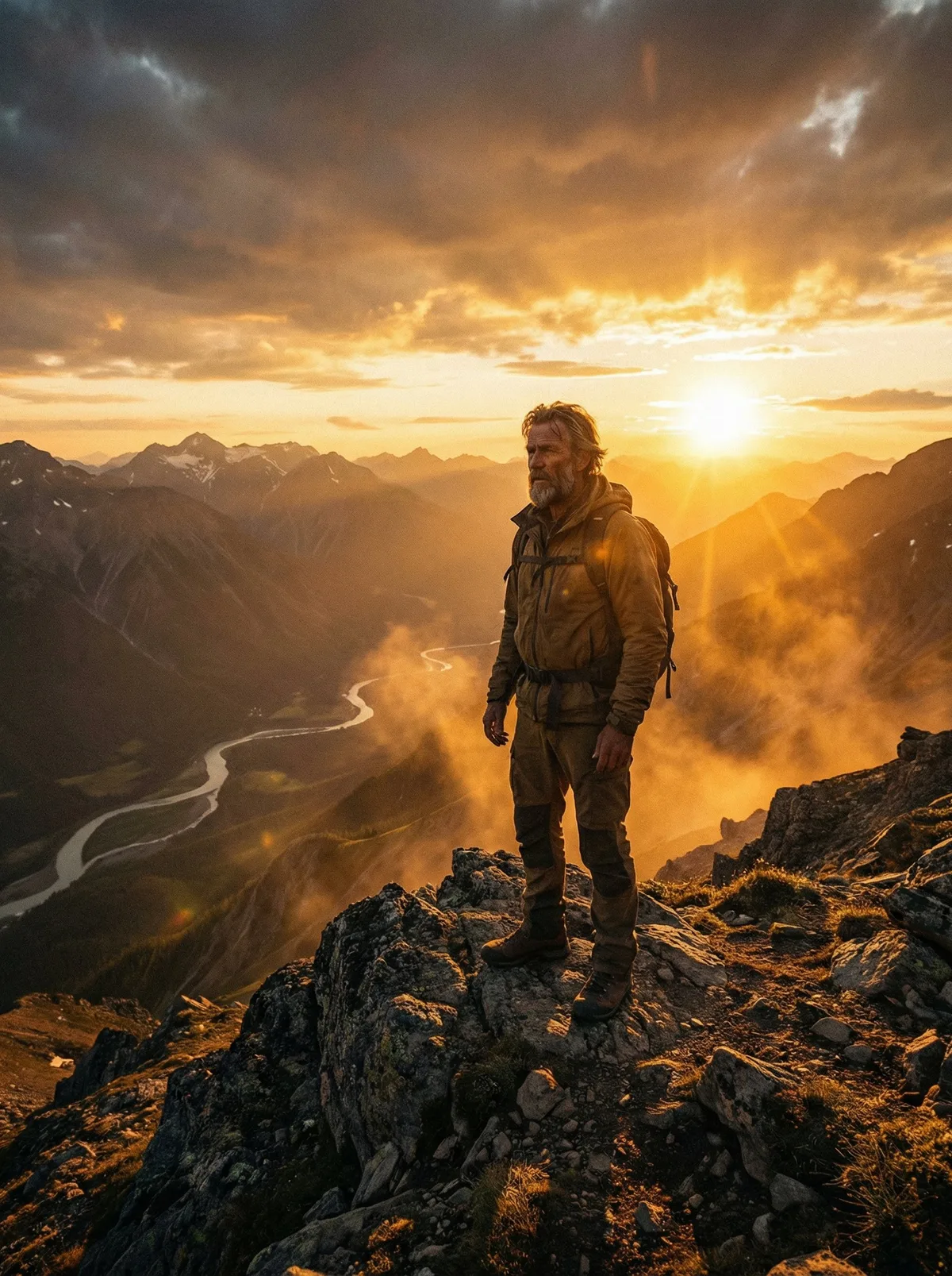 мужчина на фоне природы, горы, закат, сильный свет, эпичная атмосфера, wide cinematic shot, ultra realistic