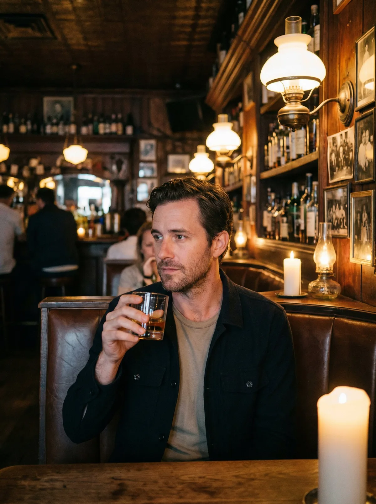 мужчина в баре, мягкий теплый свет, бокал в руке, атмосферный интерьер, cinematic lighting, realistic mood