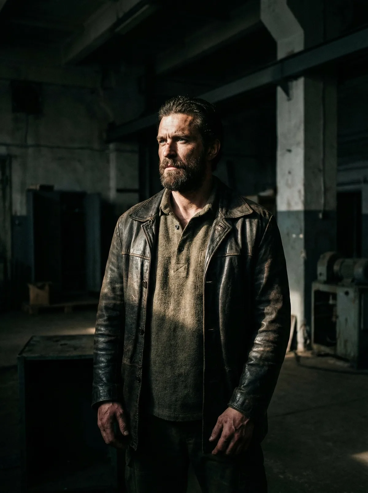 брутальный мужчина в темной студии, направленный свет, глубокие тени, dramatic lighting, cinematic portrait, high detail