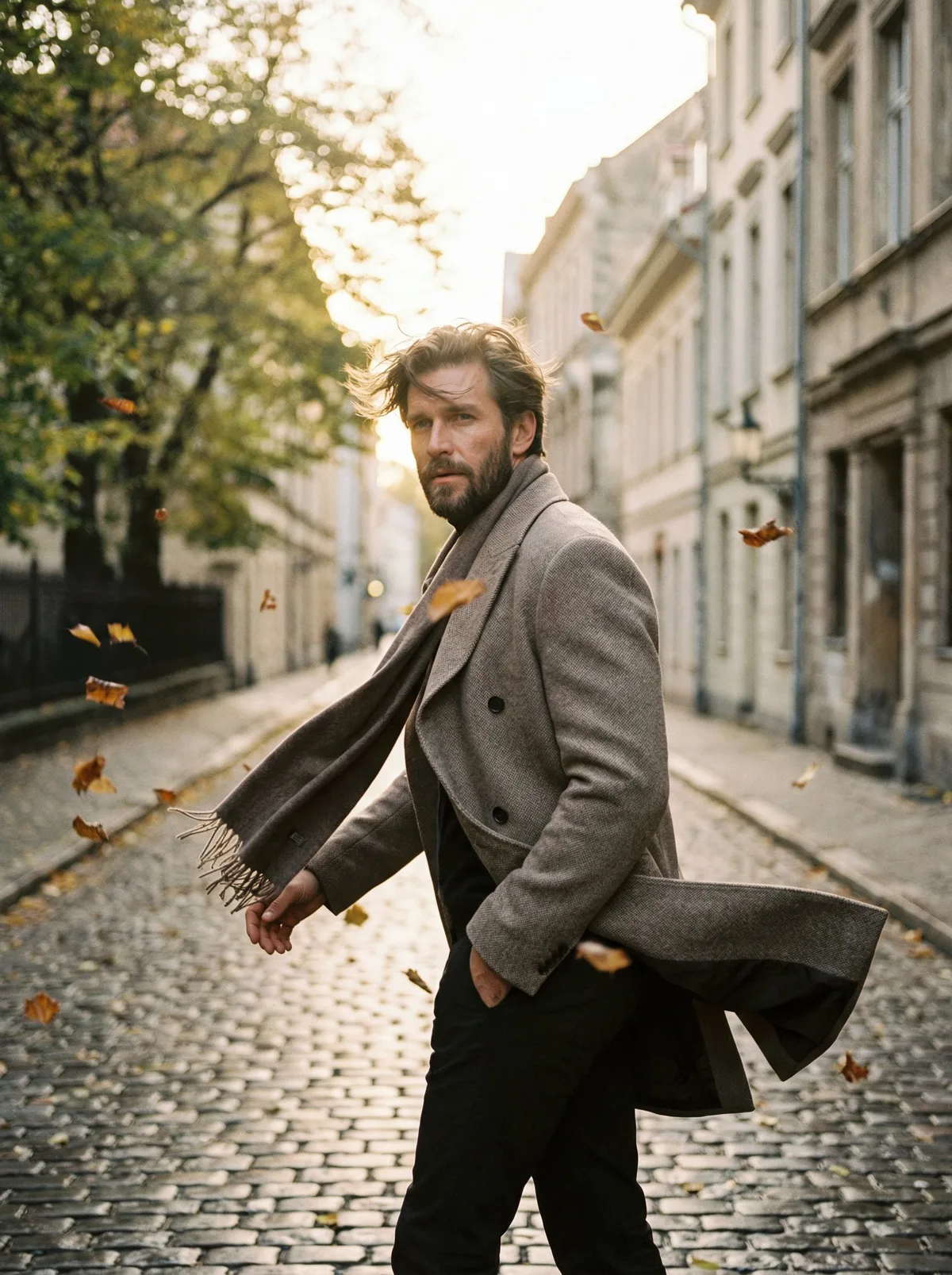 мужчина в стильном пальто, осенняя улица, мягкий свет, ветер, fashion photography, cinematic look