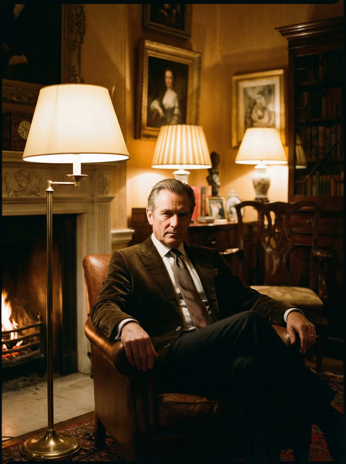 портрет мужчины в стиле luxury, дорогой интерьер, мягкое теплое освещение, элегантный образ, cinematic shadows