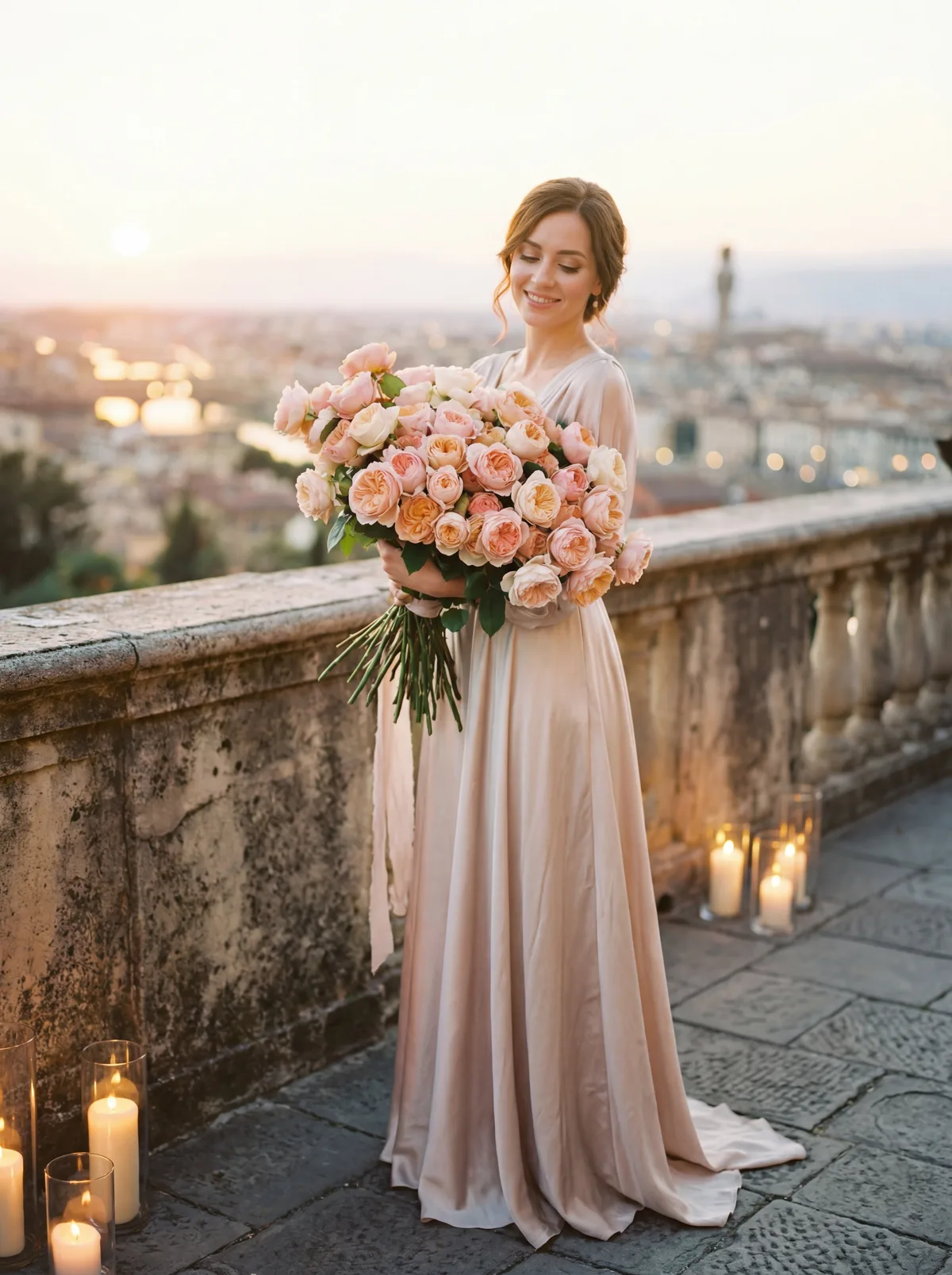 девушка в элегантном платье с букетом цветов, студийная съемка, мягкий рассеянный свет, светлый фон, 8 марта настроение, cinematic lighting