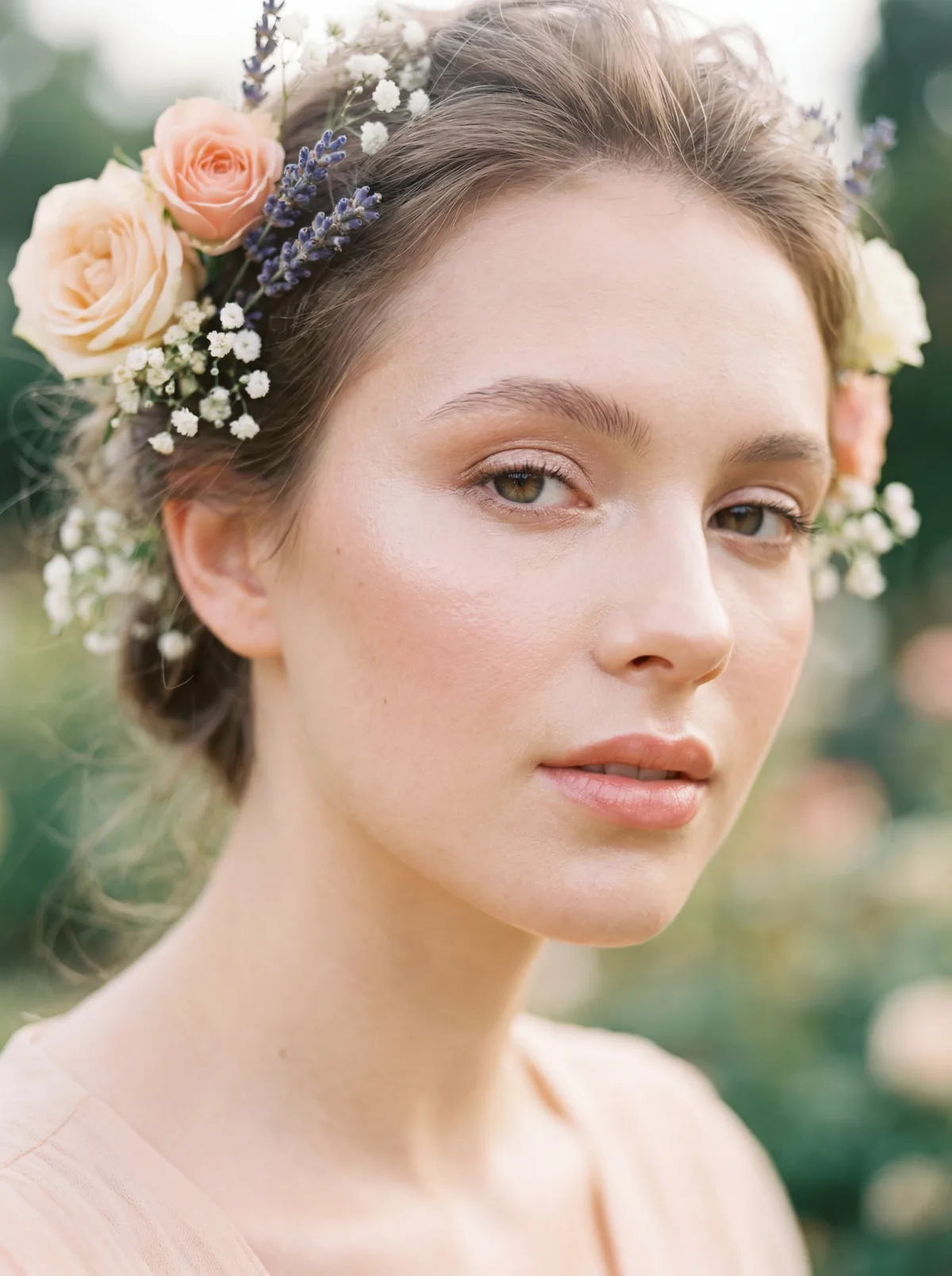 портрет девушки среди цветов, розы и пионы, мягкое освещение, dreamy aesthetic, нежная атмосфера, shallow depth of field, high detail