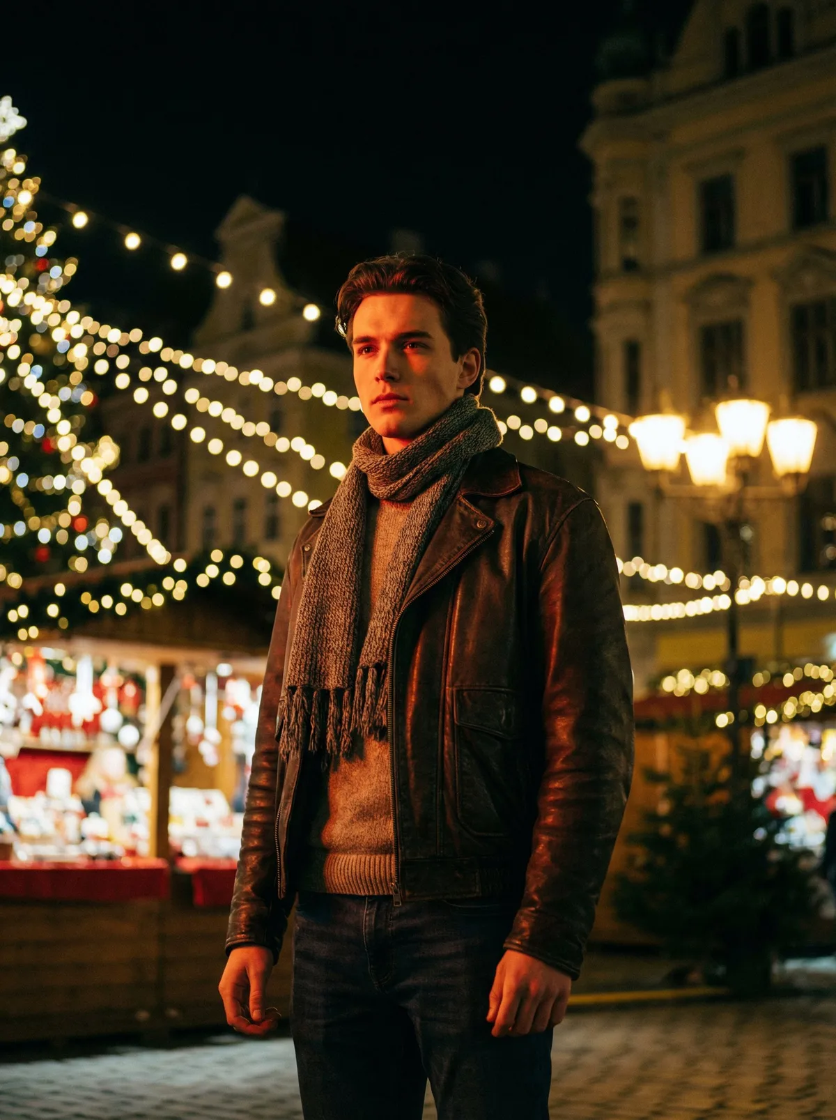 парень в стильном образе на фоне праздничных огней, вечерняя атмосфера, контрастное освещение, cinematic portrait