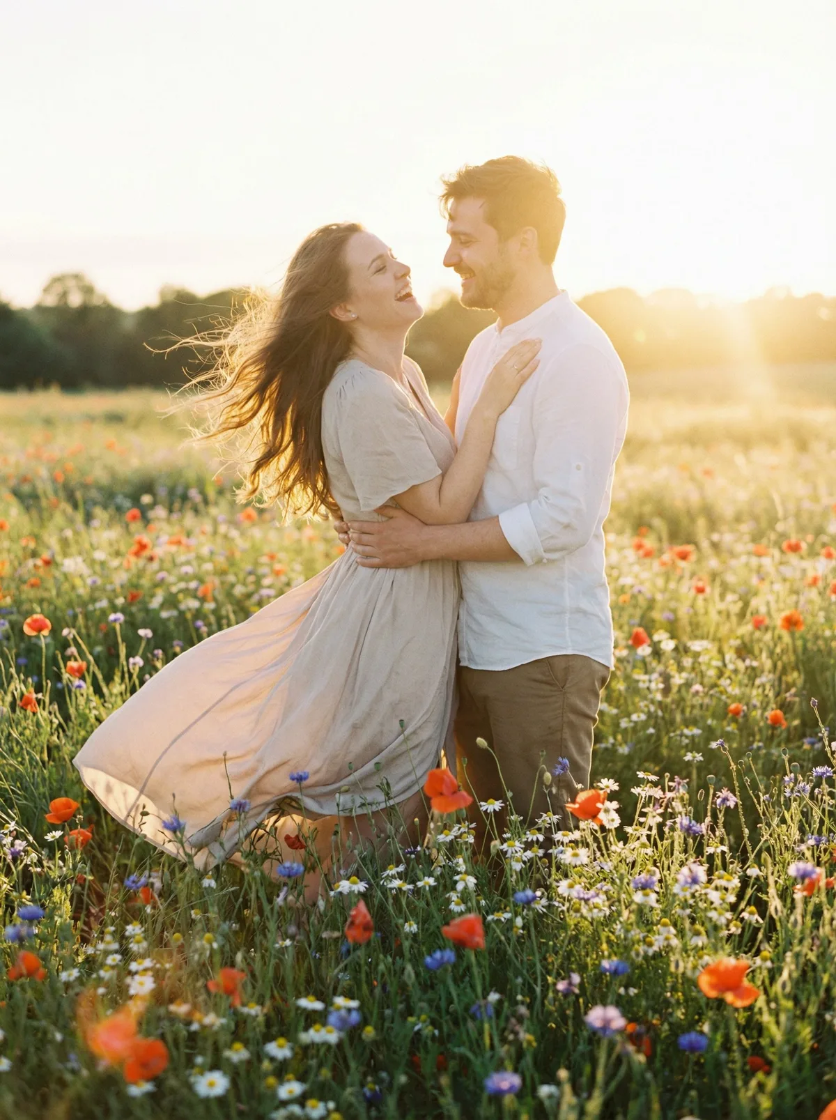 пара на природе, поле с цветами, солнечный свет, ветер, dreamy aesthetic, нежная атмосфера, high detail