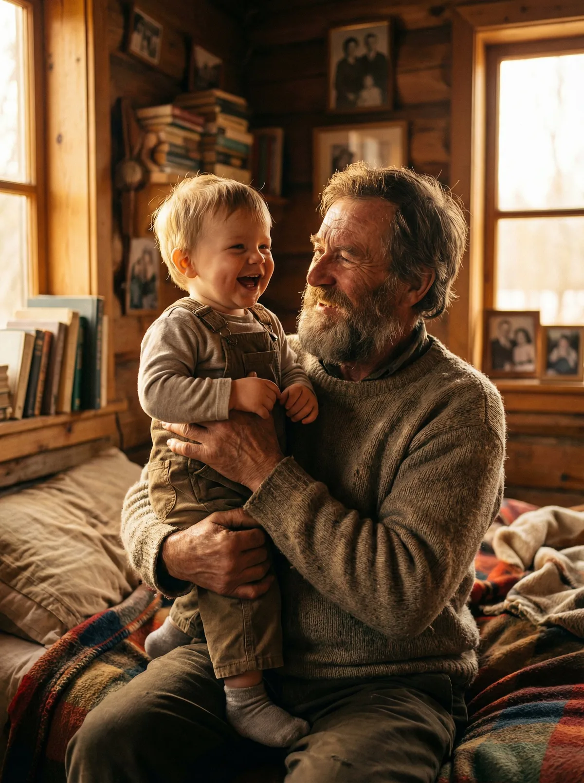 дед держит внука на руках, теплая атмосфера, мягкий свет, искренние эмоции, ultra realistic, high detail