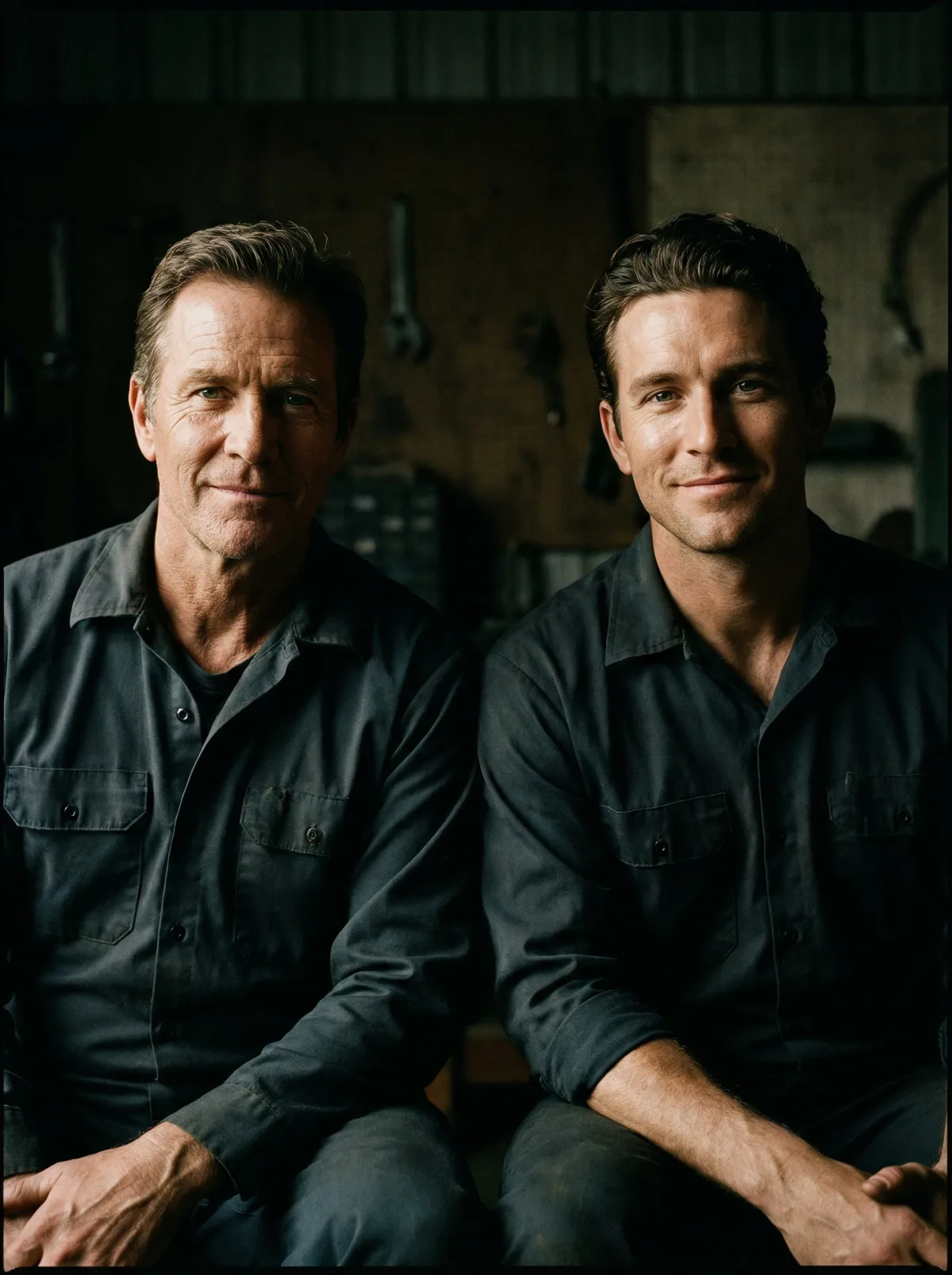 портрет отца и сына, одинаковая поза и выражение лица, контрастное освещение, акцент на сходстве, cinematic portrait