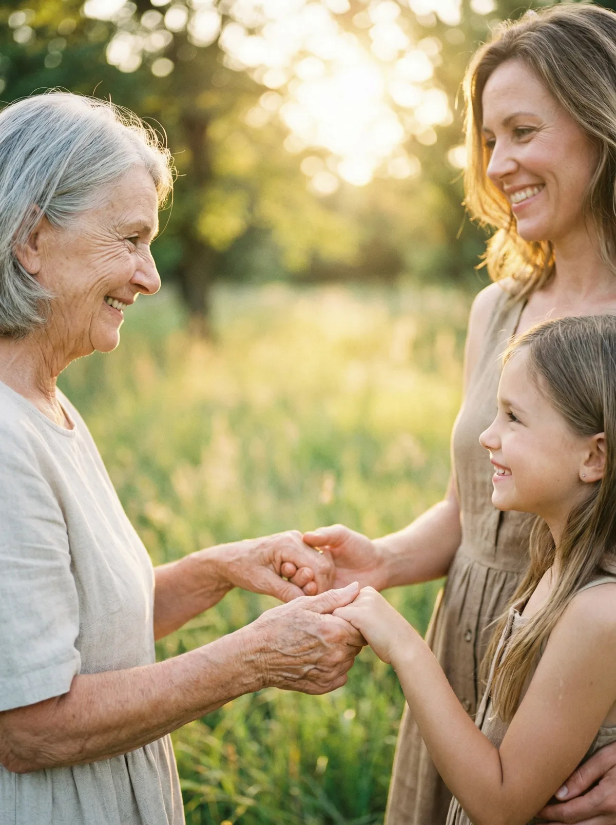 бабушка, мама и дочь держатся за руки, мягкий свет, теплые эмоции, акцент на связи поколений, ultra realistic