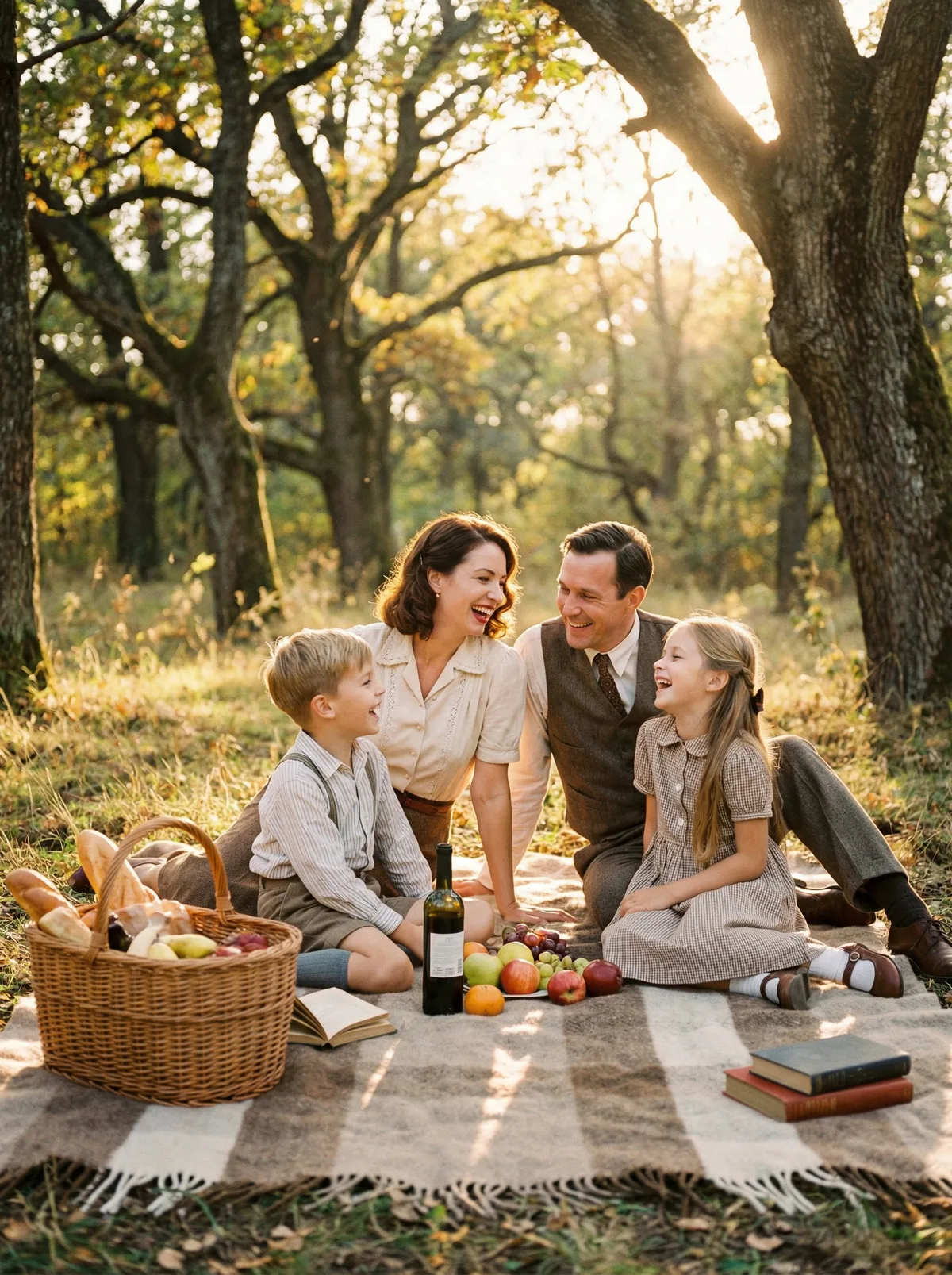 семья на пикнике, плед, корзина, солнечный свет, уютная атмосфера, теплые цвета, cinematic photography