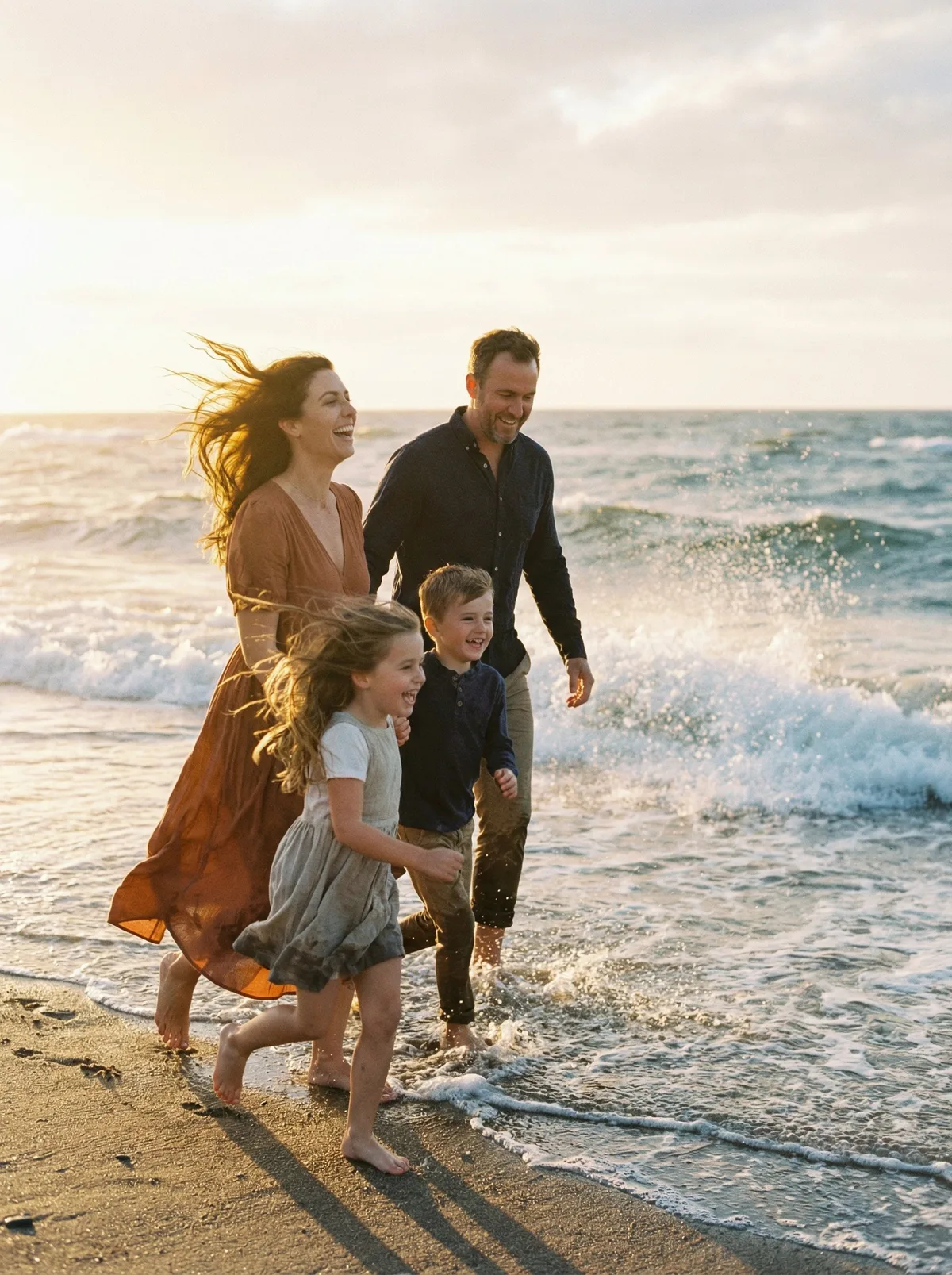 семья на пляже, закат, теплый свет, море, ветер, естественные эмоции, cinematic beach scene