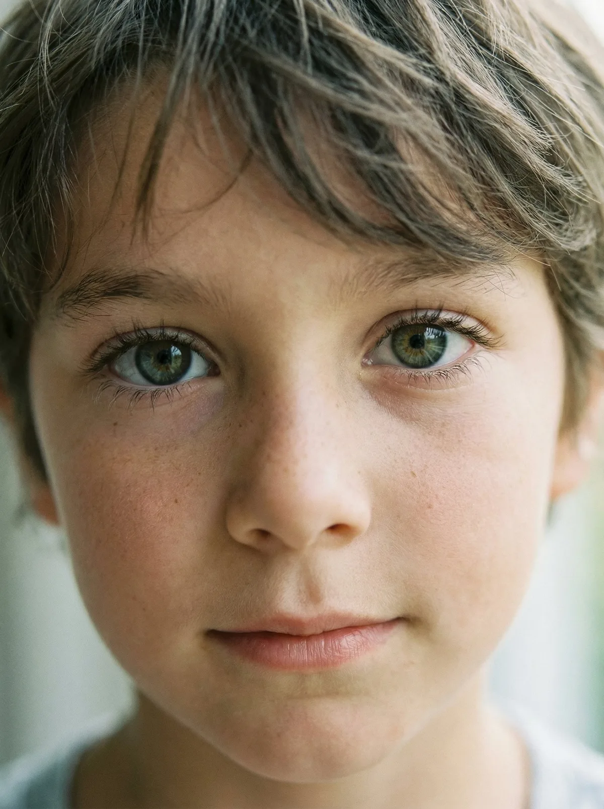 портрет ребенка крупным планом, акцент на глазах, мягкий свет, натуральная кожа, beauty child photography, ultra detailed