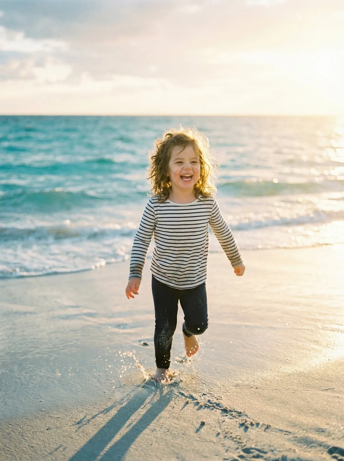 ребенок на пляже, солнечный свет, песок, море, радостные эмоции, cinematic beach photo